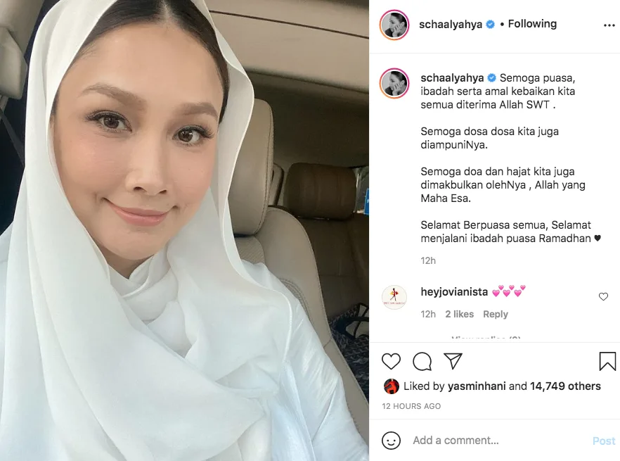 Nampaknya wajah pelakon dan pengacara ini semakin berseri-seri selepas melahirkan cahaya mata kedua. Di akaun instagramnya, Scha Alyahya, ini juga terlihat begitu jelita mengenakan tudung sambil mengucapkan salam Ramadan kepada peminatnya.