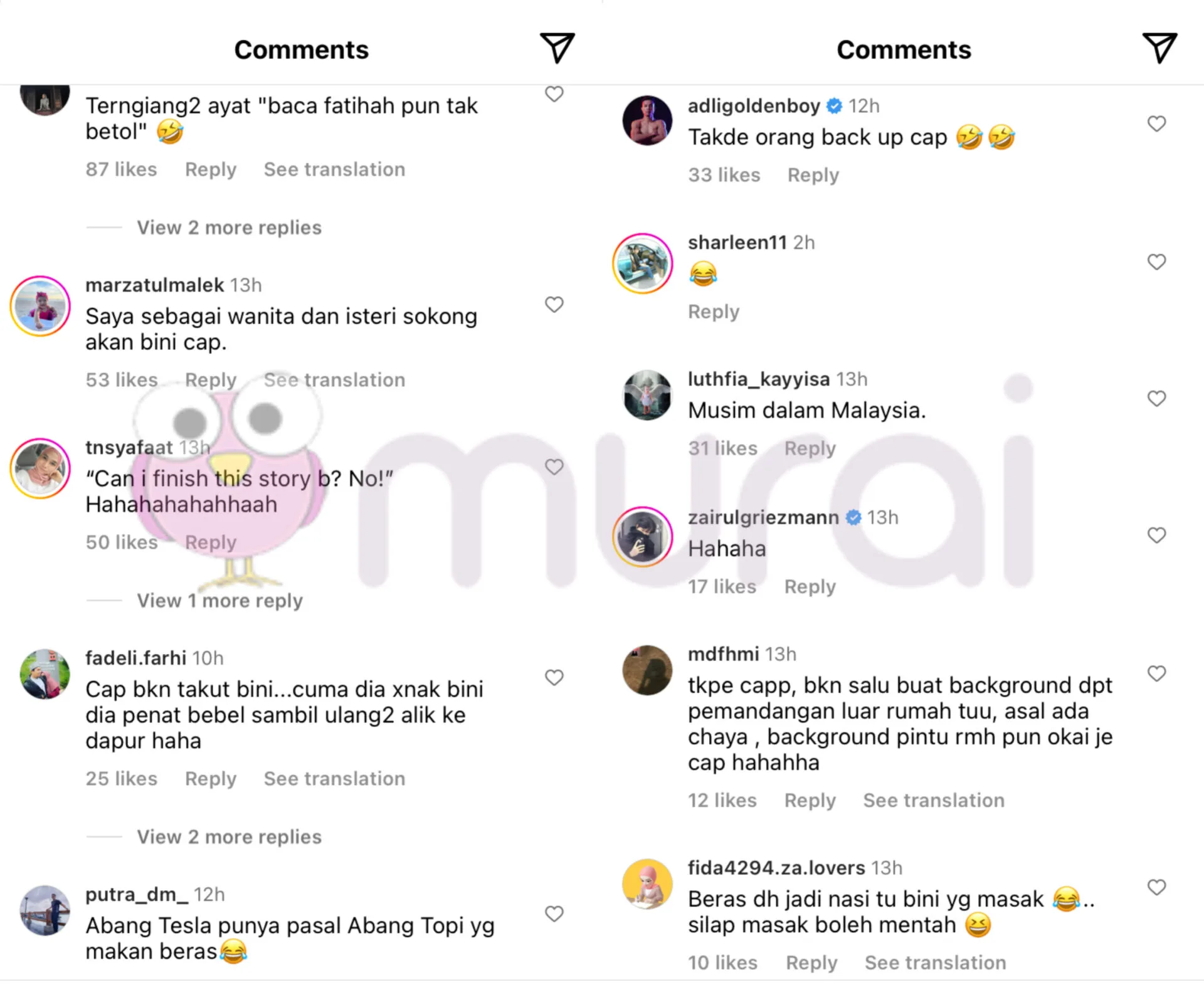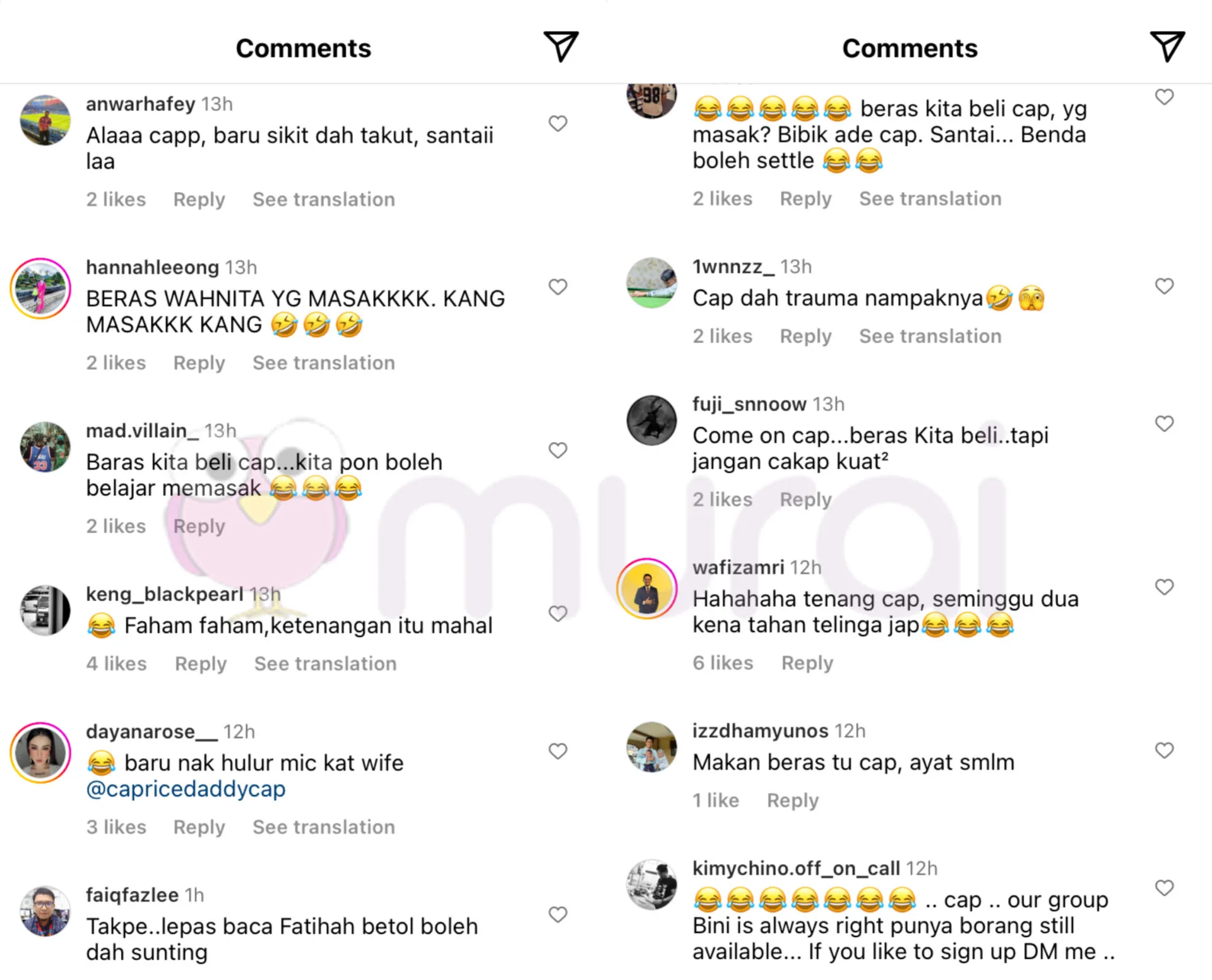 Hantaran Caprice turut dibanjiri dengan komen netizen yang berseloroh menyifatkan penyanyi rap tidak mahu mengulas isu poligami kerana tidak mahu isterinya penat berleter sambil berulang-alik ke dapur.