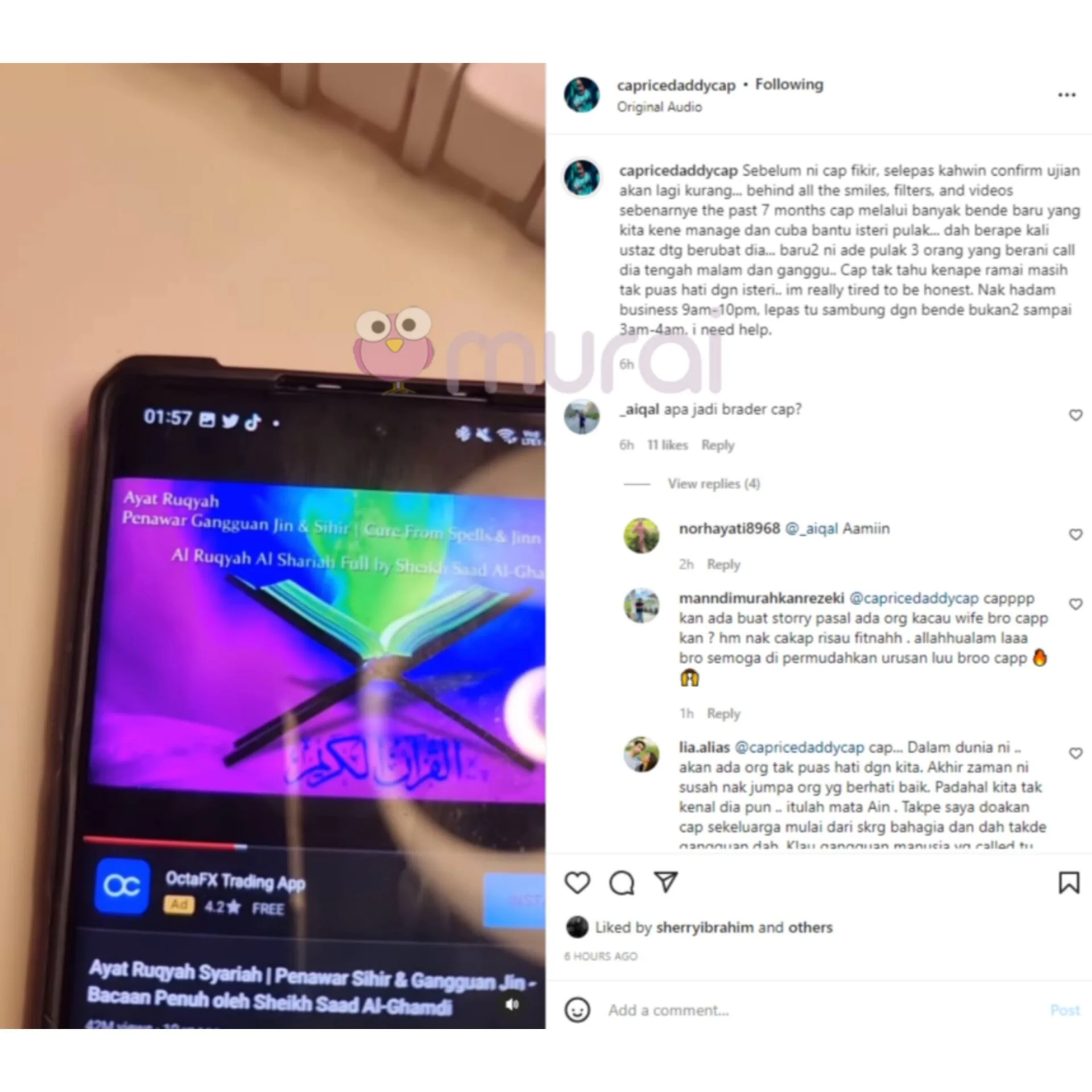 “Sebelum ni Cap fikir, selepas kahwin confirm ujian akan lagi kurang. Behind all the smiles, filters and videos sebenarnya the past 7 months Cap melalui banyak benda baru yang kita kena manage dan cuba bantu isteri pulak. Dah berapa kali ustaz datang berubat dia.”-Kata Caprice