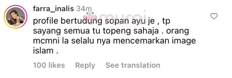 “Profil bertudung sopan ayu je, tapi sayang semua tu topeng sahaja. Orang macam ni la selalunya mencemarkan imej Islam.”-komen Farra Inalis