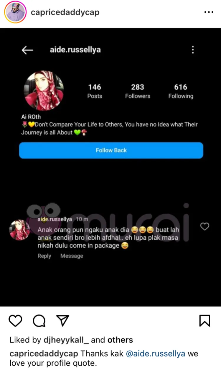 “Thanks kak @aide.russelya. We love your profile quote.”-balas Caprice