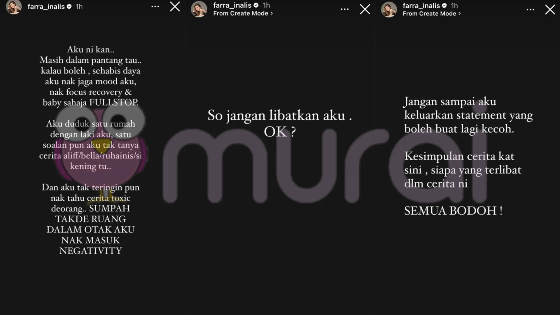 Isteri kepada penyanyi rap, Caprice iaitu Farra Inalis meluahkan rasa berang apabila namanya turut dipetik dalam kemelut di antara Aliff Aziz, Ruhainies, Bella Astillah, Sarah Yasmine serta suaminya, Caprice di media sosial.