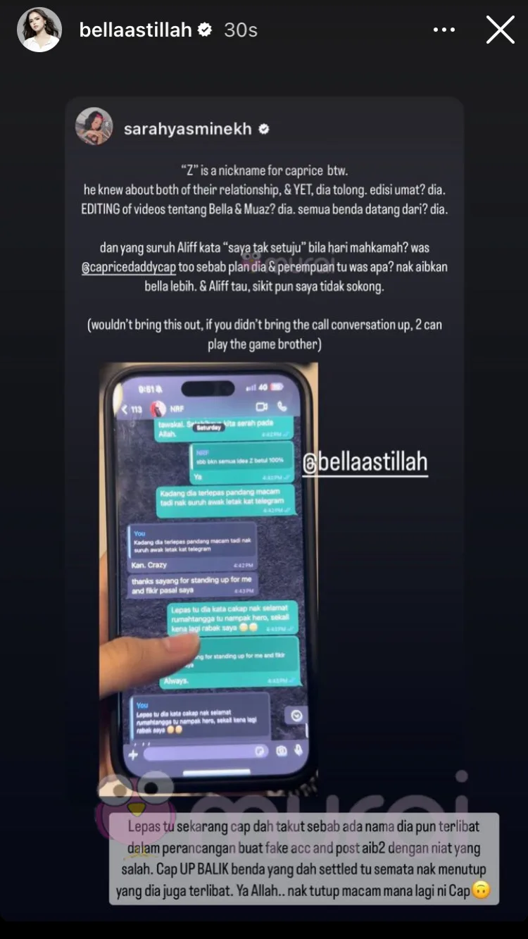 Dedah Sarah Yasmine di Insta Stories, Caprice dikatakan menjadi dalang serta turut menasihati Aliff untuk tidak bercerai dengan Bella ketika sebutan kes di mahkamah pada awal April lalu.