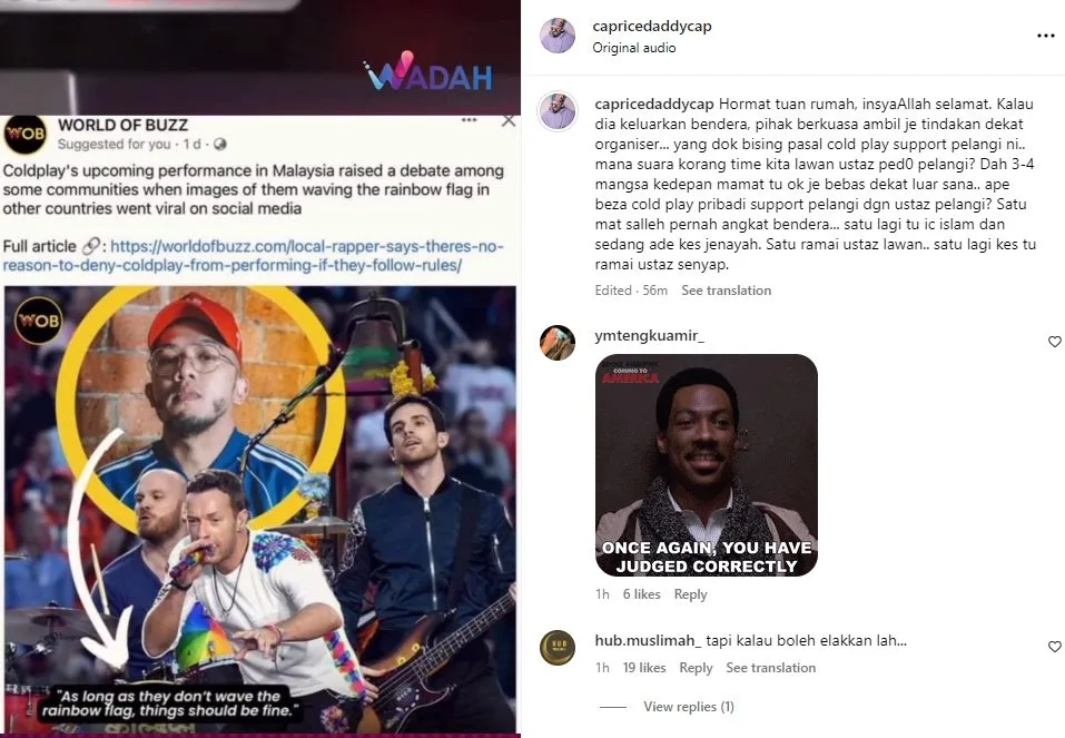 Penyanyi rap dan usahawan, Caprice bersuara mengenai isu kumpulan Coldplay yang dikatakan memberi sokongan terhadap golongan lesbian, gay, biseksual dan transgender (LGBT).