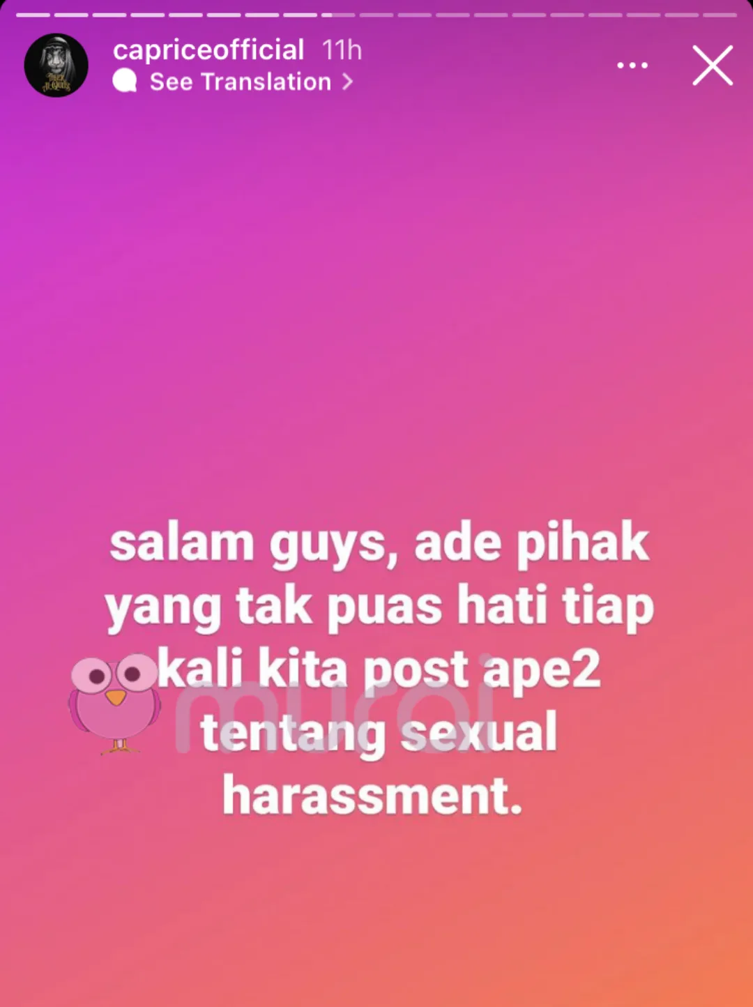 “Salam guys, ada pihak yang tak puas hati tiap kali kita post apa-apa tentang sexual harassment.”- dedah Caprice