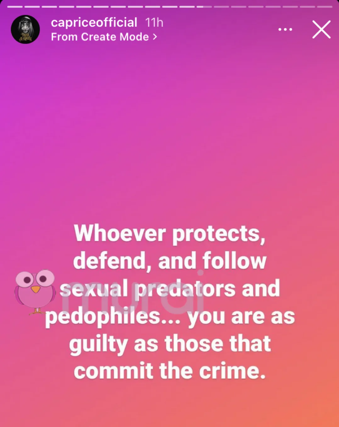 Menerusi hantaran di Instagram, Caprice turut mendedahkan bahawa terdapat pihak yang tidak berpuas hati dengannya yang sering melakukan posting mengenai gangguan seksual yang berlaku.