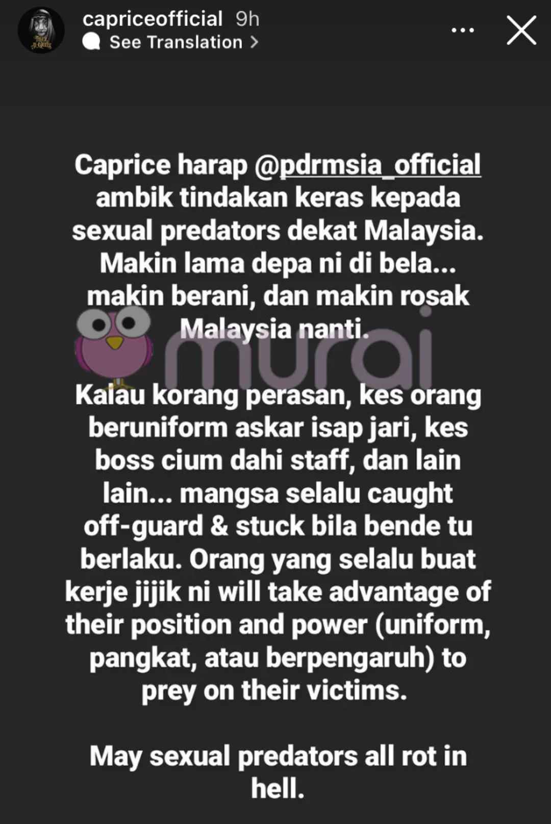 “Caprice harap @pdrmsia_official ambik tindakan keras kepada sexual predators dekat Malaysia. Makin lama depa ni di bela..makin berani, dan makin rosak Malaysia nanti.”-luah Caprice