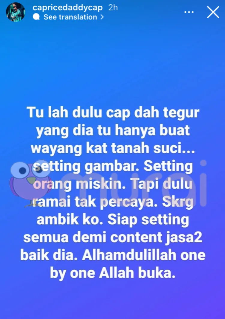 “Tu lah dulu Cap dah tegur yang dia tu hanya buat wayang kat Tanah Suci. Setting gambar orang miskin. Tapi dulu ramai yang tak percaya.”-Tulis Caprice