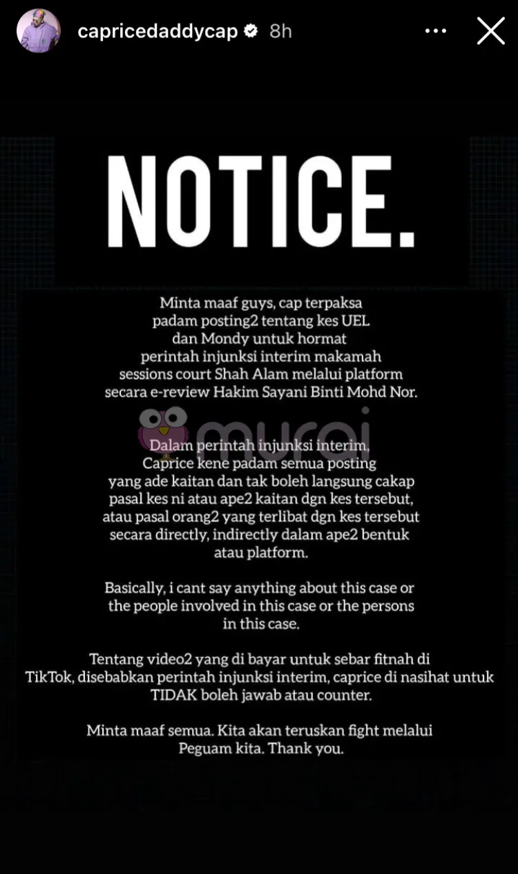 “Dalam perintah injunksi interim, Caprice kena pada semua posting yang ada kaitan dan tak boleh langsung cakap pasal kes ni atau apa-apa kaitan dengan kes tersebut, atau pasal orang-orang yang terlibat dengan kes tersebut secara directly, indirectly dalam apa-apa bentuk atau platform.”-tulis Caprice di Instagram