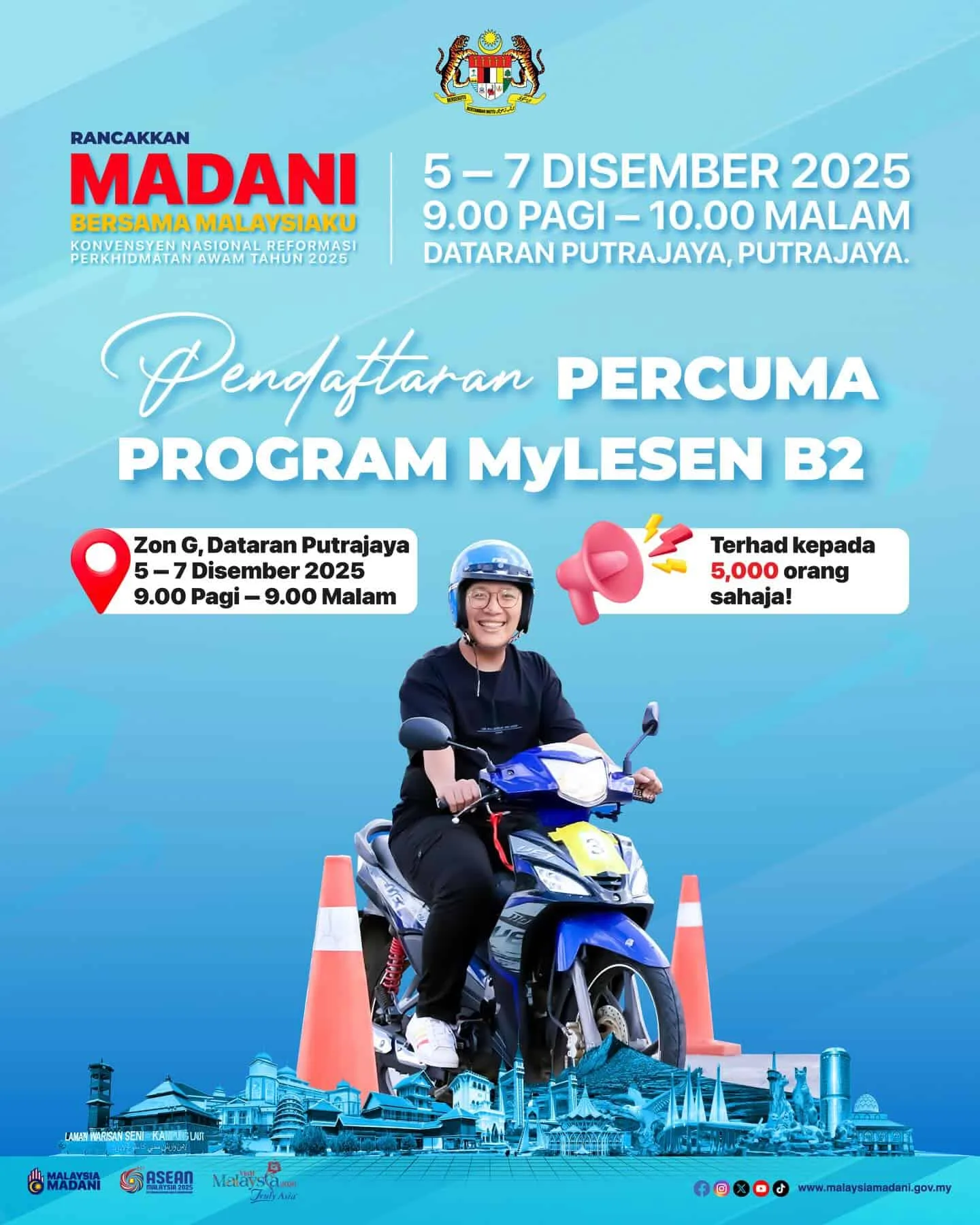 Berita baik untuk belia Putrajaya! Program Pendaftaran MyLesen B2 JPJ kini dibuka untuk warganegara Malaysia berumur 16–35 tahun, khas untuk golongan B40, pelajar, dan belia yang ingin mendapatkan lesen motosikal B2 secara percuma. Semua kos latihan, kelas teori, amali dan ujian ditanggung kerajaan.