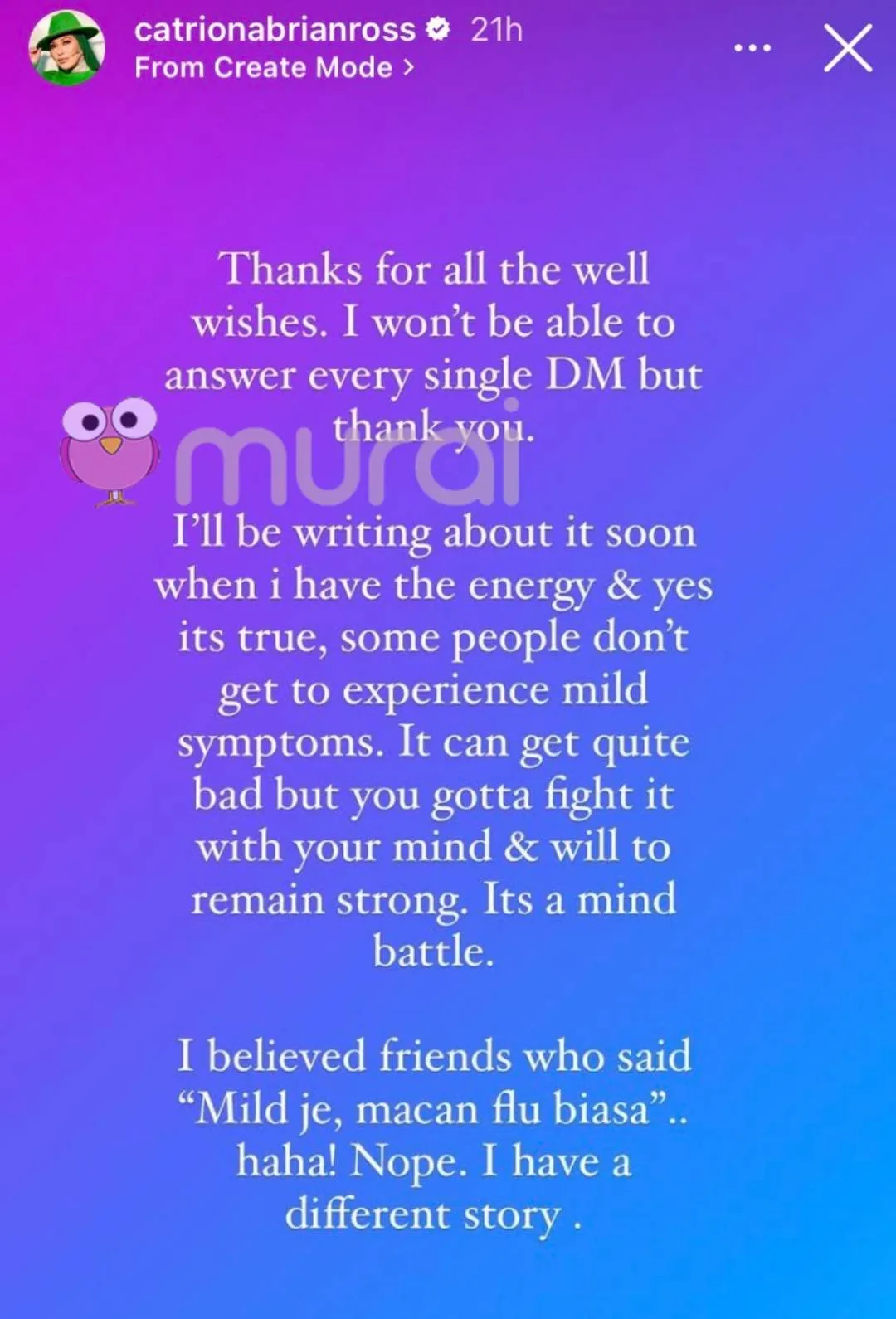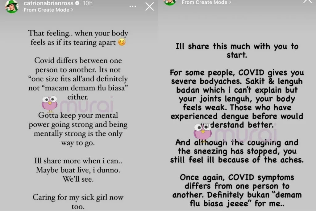 Di akhir Insta Stories nya, Catriona menegaskan bahawa gejala COVID adalah berbeza terhadap seseorang individu dengan yang lain dan mengakui ianya bukan “demam flu biasa” yang berlaku pada dirinya.