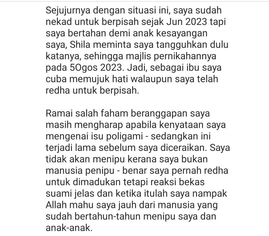 Kata Fauziah, bukanlah niatnya untuk membuka aib bekas suaminya, namun dia merasakan pelu tampil memberi penjelasan kepada umum.