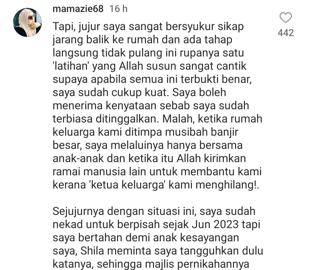 Fauziah mendedahkan hal ini menerusi beberapa rantaian kenyataan dalam ruangan komen di instagram peribadinya @mamazie68.