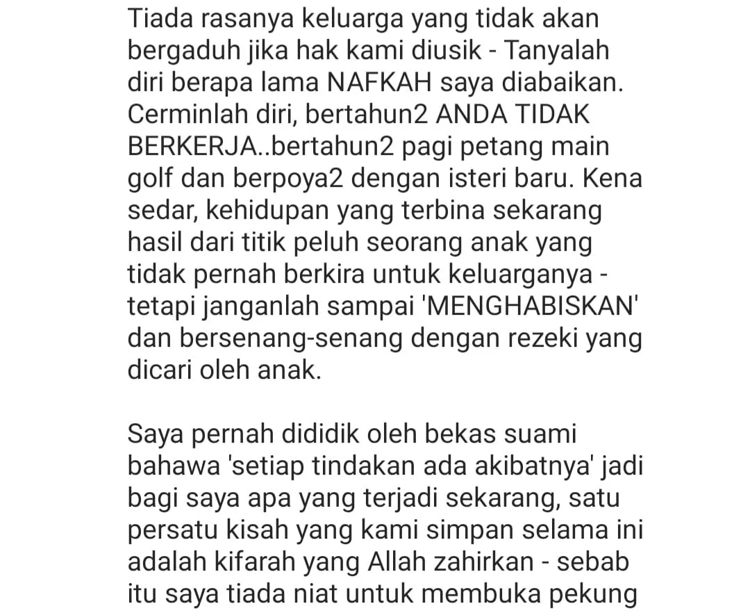“Tiada rasanya keluarga yang tidak akan bergaduh jika hak kami diusik. Tanyalah diri berapa lama nafkah saya diabaikan. Cerminlah diri, bertahun tahun pagi petang main golf dan berfoya-foya dengan isteri baru.