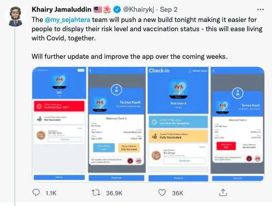 “Pasukan @my_sejahtera akan mengemaskin aplikasi malam ini untuk memudahkan orang untuk menunjukkan tahap risiko dan status vaksinasi – ini akan memudahkan hidup bersama Covid,” kata tweet itu.