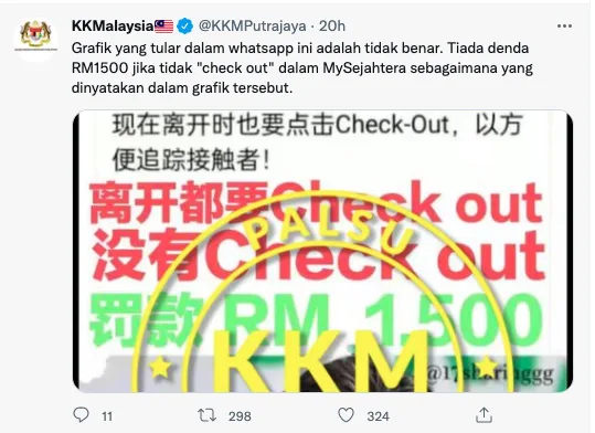 “Grafik yang tular dalam whatsapp ini adalah tidak benar. Tiada denda RM1500 jika tidak “check out” dalam MySejahtera sebagaimana yang dinyatakan dalam grafik tersebut.