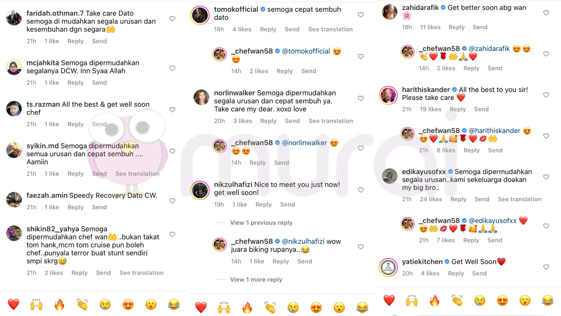 Tinjauan Murai My di ruangan komen mendapati rata-rata netizen dan rakan selebriti termasuklah Zahida Rafik, Harith Iskander,dan ramai lagi mendoakan agar chef selebriti ini diberikan kesembuhan dengan cepat.