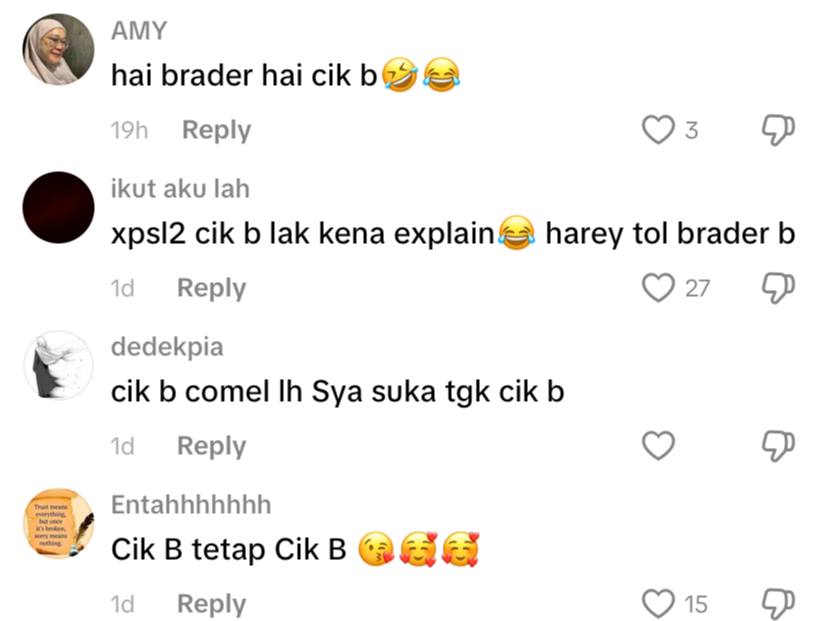 Tidak hairanlah ruangan komen dibanjiri reaksi lucu dan sokongan peminat yang menganggap Cik B sentiasa mempunyai cara tersendiri untuk menceriakan hari mereka.