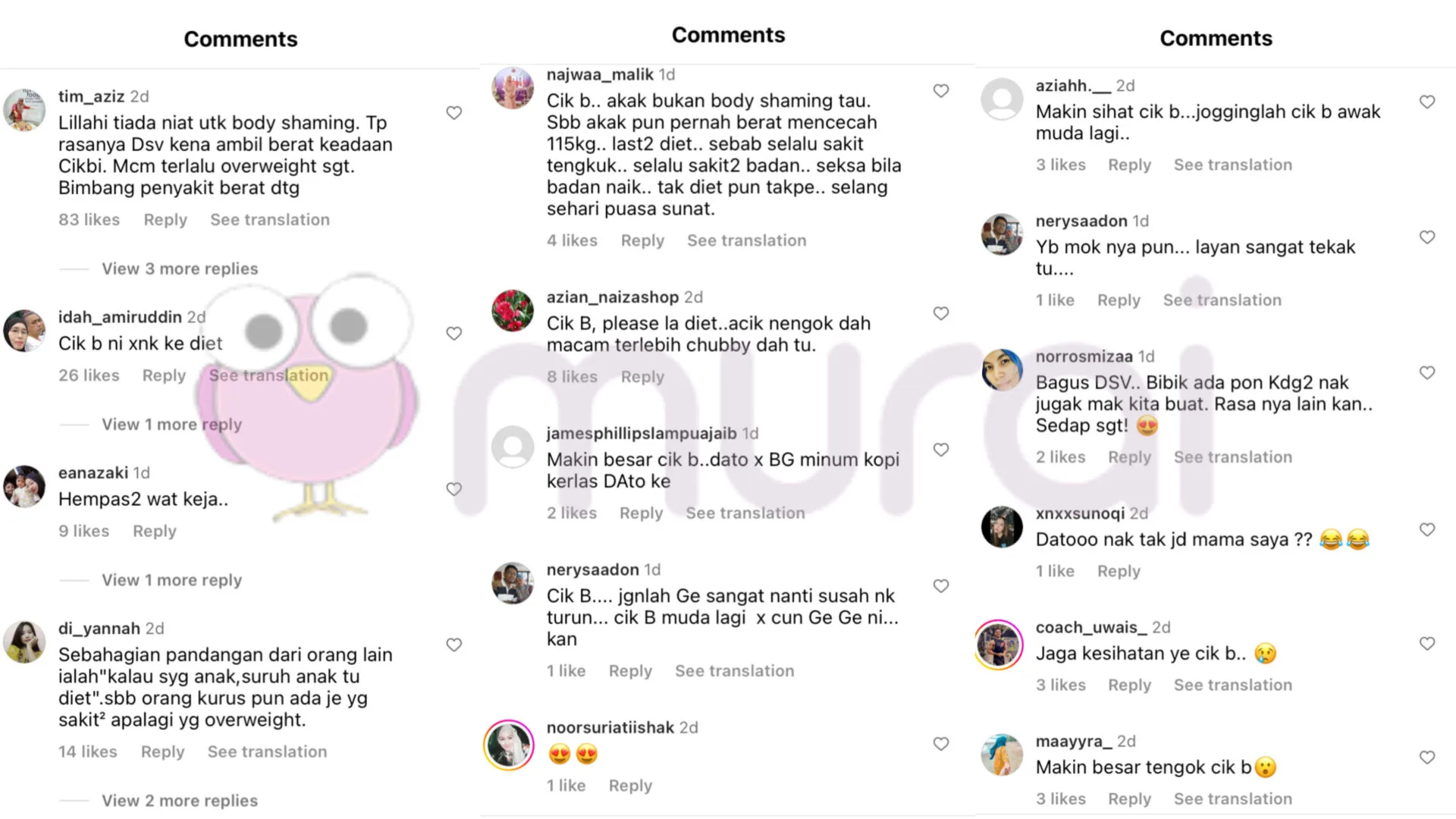 “Lillahi tiada niat untuk body shaming. Tp rasanya DSV kena ambil berat keadaan Cik B. Macam terlalu overweight sangat. Bimbang penyakit berat datang.”