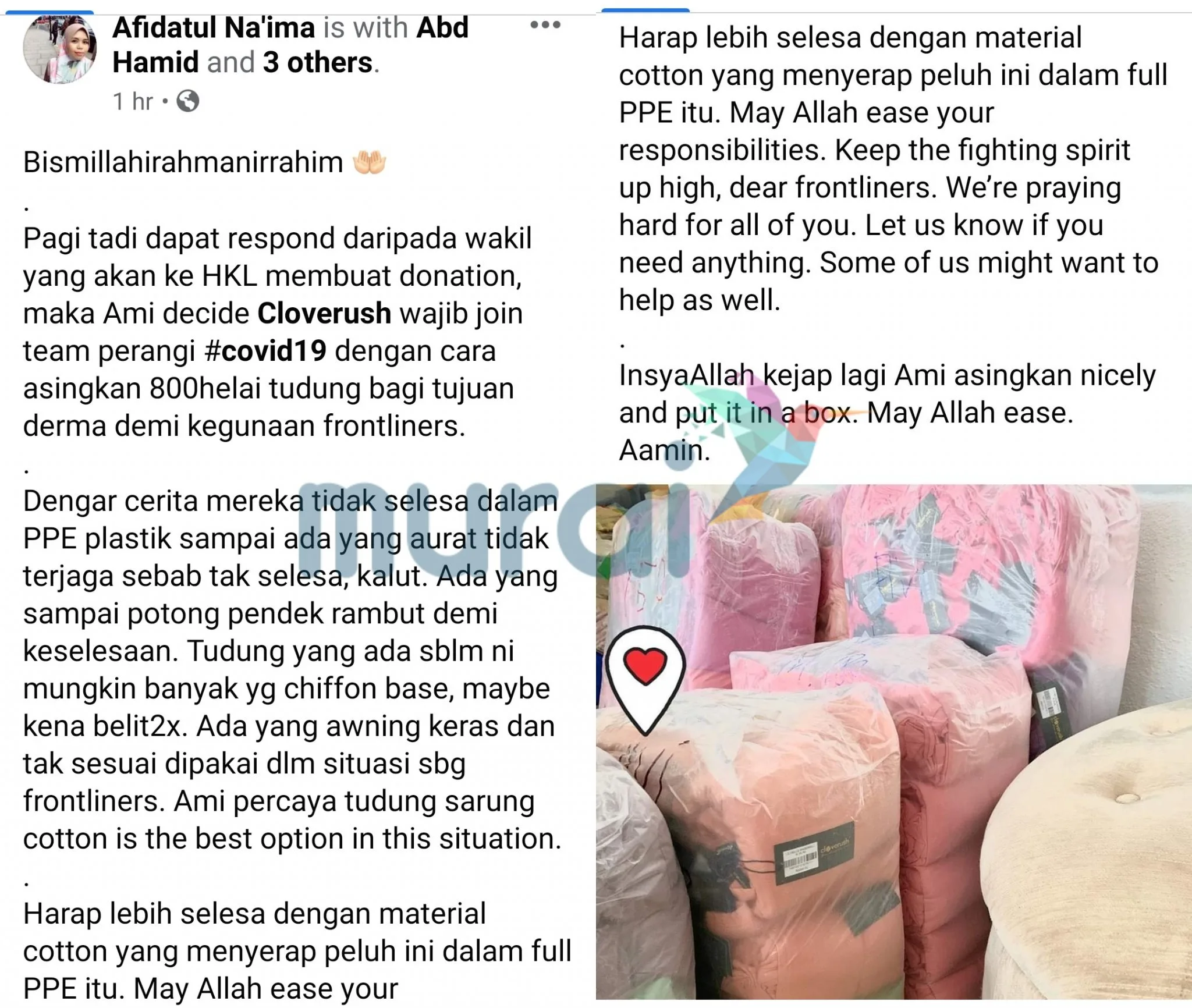 Owner tudung Cloverush donate 800 tudung baru to hospital frontliners — untuk keselesaan mereka.