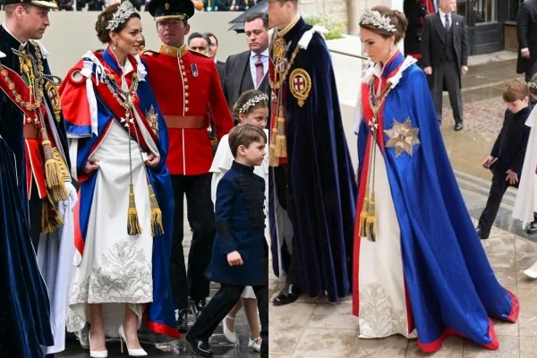Untuk Kate, Puteri Wales ini tampil mengenakan gaun sutera crepe Alexander McQueen dalam rona ivory yang disulam di bawahnya. Sulaman itu terdiri daripada floral kebangsaan United Kingdom; ros untuk England, duri untuk Scotland, daffodil untuk Wales dan shamrocks untuk Ireland. Mantelnya pula diperbuat daripada Royal Victorian Order dalam rona biru dan merah scarlet.