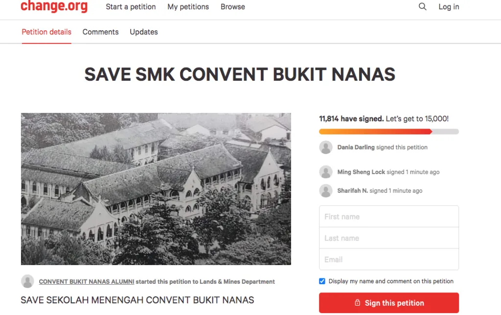 Menurut tinjauan kami di laman Petition.org, sebuah petisyen bertajuk “SAVE SMK CONVENT BUKIT NANAS’ telah dibuat. Sebanyak 15 ribu tandatangan diperlukan. Petisyen itu mengajak orang ramai untuk menyokong sekolah untuk pembaharuan pajakan.