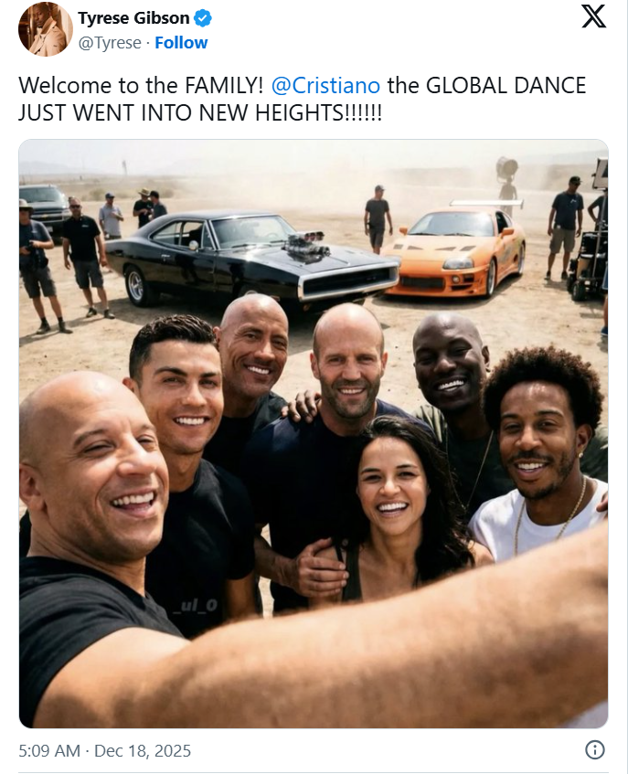 Perkara itu mula jadi perbualan selepas pelakon Tyrese Gibson berkongsi foto melalui X di lokasi penggambaran yang memaparkan Ronaldo bersama barisan pelakon utama seperti Vin Diesel, Dwayne Johson, Jason Statham, Ludacris dan Jordana Brewster.