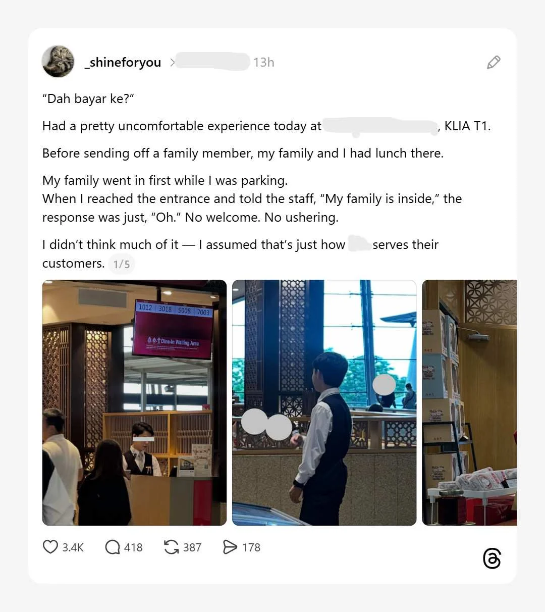 Apabila tiba di pintu masuk dan memberitahu bahawa keluarganya sudah berada di dalam, respon staf yang diterima hanyalah ringkas tanpa sapaan atau iringan ke meja.