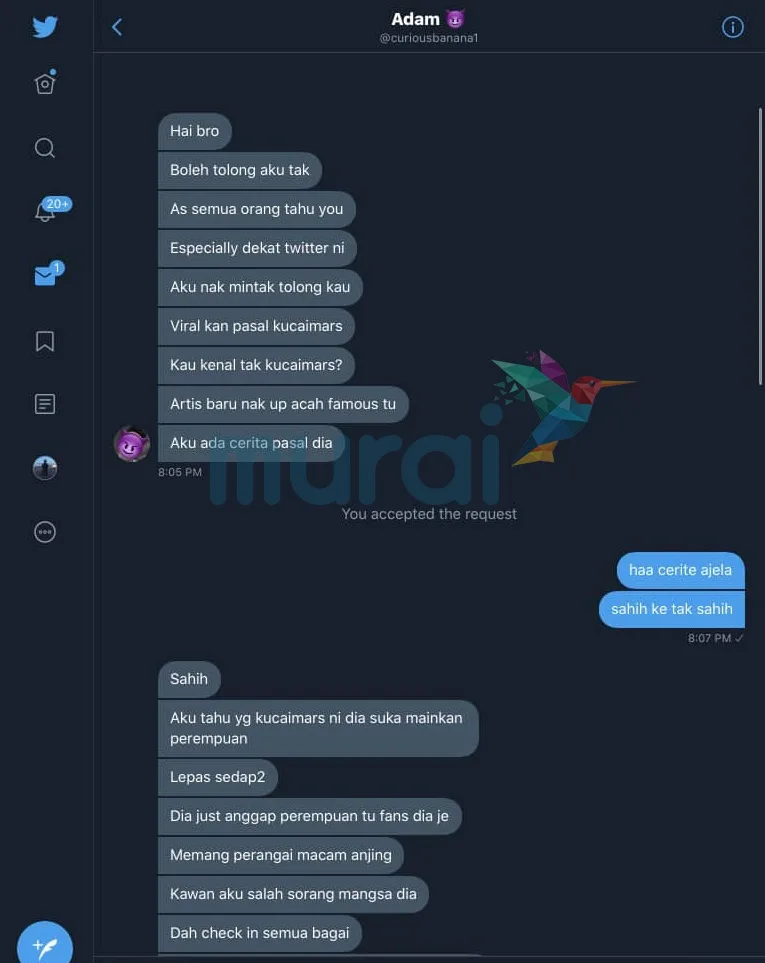 Menurut pengguna tersebut kepada seorang pengamal laman Twitter dikenali sebagai @PejuangJlnLurus, dia berkata Kucaimars atau nama sebenarnya Amirul Husyairi Nani,23 telah memperdaya dan mempermainkan perasaan ramai perempuan. Lebih mengejutkan, dedahnya, pelantun Khayalan ini juga pernah menginap di sebuah hotel bersama seorang perempuan yang mana merupakan kenalan kepada netizen itu.