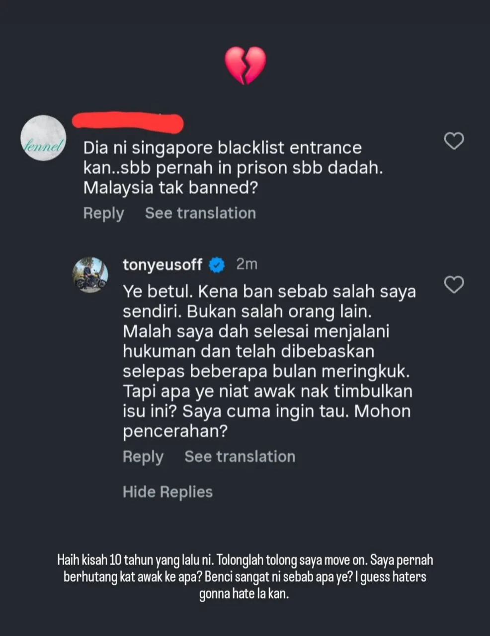 Reaksi itu timbul selepas seorang pengguna media sosial meninggalkan komen yang mempertikaikan kedudukannya dalam industri seni dengan menyatakan bahawa dia pernah masuk penjara atas kesalahan dadah dan kini disenarai hitam di Singapura. Individu itu turut mempersoalkan kenapa Malaysia tidak mengambil tindakan yang sama. Menyedari komen tersebut mencetuskan kembali peristiwa hitam dalam hidupnya, Tony tampil bersuara, meminta masyarakat agar membenarkannya untuk terus move on daripada kisah silam.