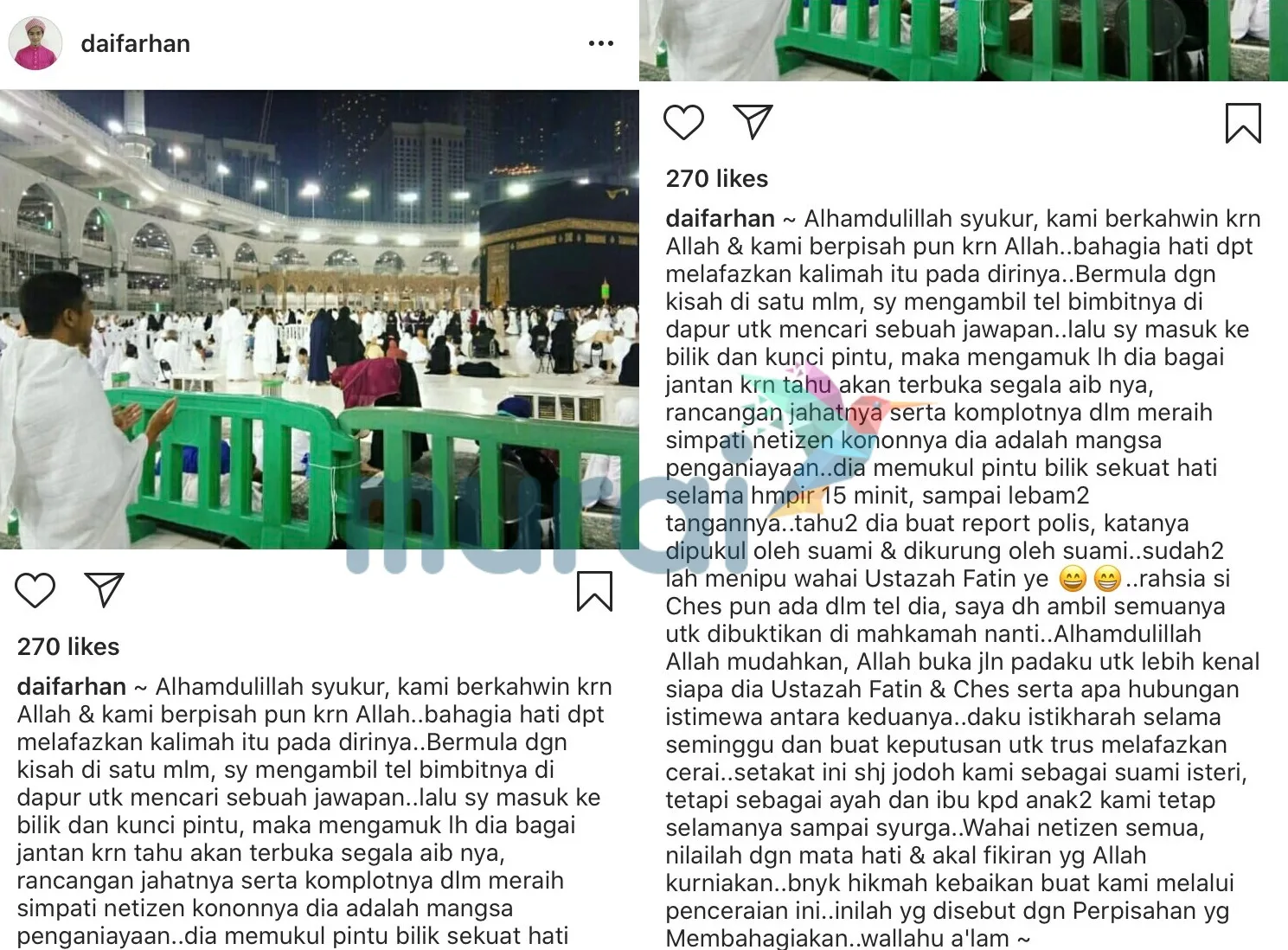 Susulan daripada itu, menerusi laman Instagram nya, Farhan mendedahkan kejadian sebenar mengapa dia melafazkan cerai terhadap Fatin.