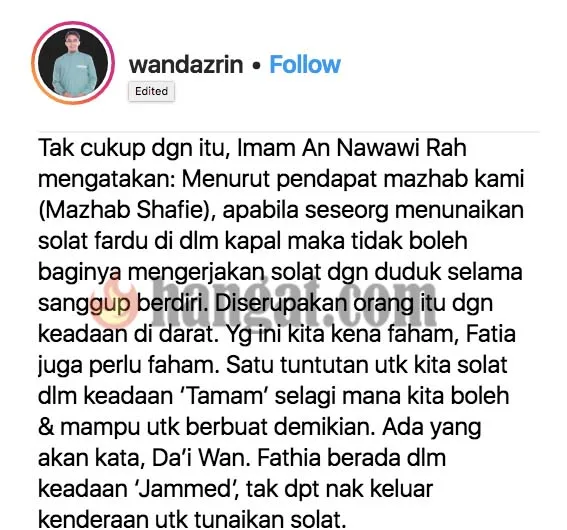 Tambah Dazrin, dia tak nafikan banyak hadith Nabi yang sahih, yang terhimpun, menceritakan bagaiman Nabi solat diatas tunggangan. Jadi kini, solat dalam kenderaan atau dalam pesawat sifatnya sama seperti yang Nabi lakukan juga, cuma kita dengan tunggangan yang lebih moden.