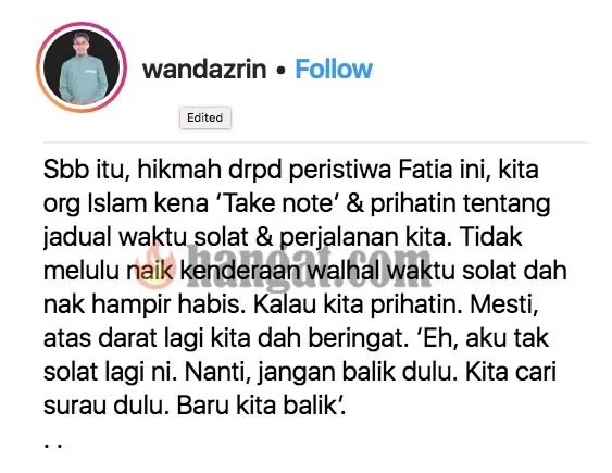 Dazrin mohon umat Islam ambil pengajaran dari isu sebegini dan menasihati umat Islam supaya prihatin tentang jadual waktu solat & perjalanan.