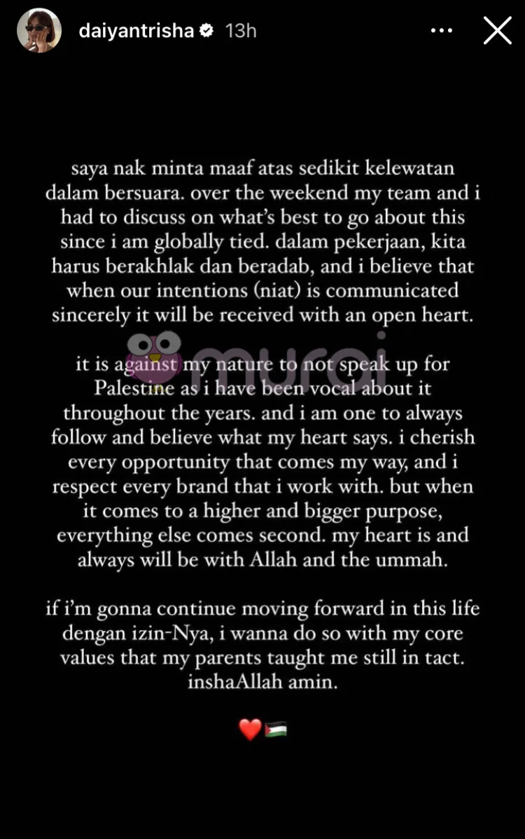 Mengakui hantarannya di media sosial mengenai P4lestin akan memberikan kesan terhadap hubungan kerjasamanya dengan jenama-jenama antarabangsa, Daiyan Trisha menerusi Instagram, menyatakan bahawa dia sudah tidak boleh berdiam diri lagi di saat saudara-mara sesama Islam di G4za sedang bertarung nyawa.