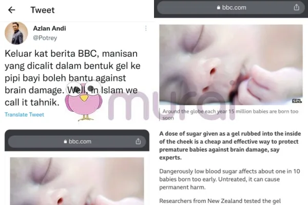 “Keluar kat berita BBC, manisan yang dicalit dalam bentuk gel ke pipi bayi boleh bantu lawan kerosakan otak. Well, in Islam we call it tahnik.” Ciapnya