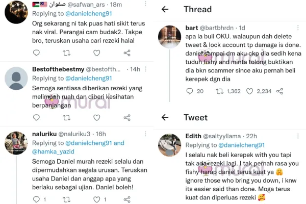 “Apalah buli OKU. Walaupun dah delete tweet & lock akaun tapi damage is done. Daniel sampai dm aku cakap dia sedih kena tuduh fishy dan minta tolong buktikan dia bukan scammer sejak aku pernah beli kerepek dengan dia.”