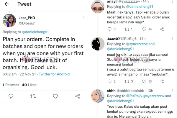 Selain itu, ada juga warganet bertanya dan persoalkan mengapa pesanan biskut pelanggan, mengambil masa terlalu lama sehingga makan masa berbulan-bulan untuk siapkan tempahan.