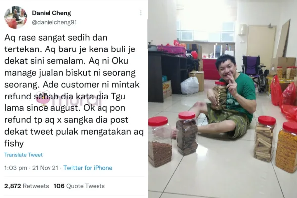 “Aku rasa sangat sedih dan tertekan. Aku baru je kena buli dekat sini semalam. Aku ni OKU urus jualan biskut ni seorang-seorang. Ada pelanggan ni minta refund sebab dia kata dia tunggu lama dari Ogos. Ok aku pun refund, tapi aku tak sangka dia post dekat tweet pula mengatakan aku fishy.” Luah Cheng di Twitter