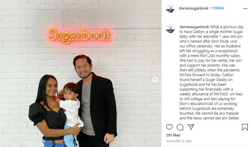 Sebelum ini Darren Chan begitu berbangga dengan pengguna Sugarbook yang merupakan seorang ibu tunggal dengan anak yang berusia setahun. Wanita bernama Caitlyn itu menggunakan aplikasi Sugarbook untuk menemui Sugar Daddy dan menyara kehidupannya.