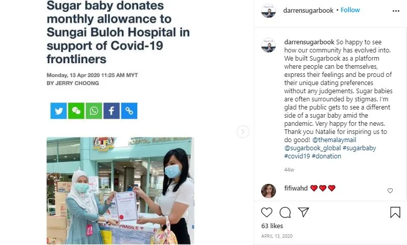 Dalam salah satu postingnya di Instagram, Darren Chan meluahkan rasa bangganya dengan salah seorang ‘Sugar Baby’ yang menggunakan aplikasi ini membuat sumbangan dan menderma kepada masyarakat.