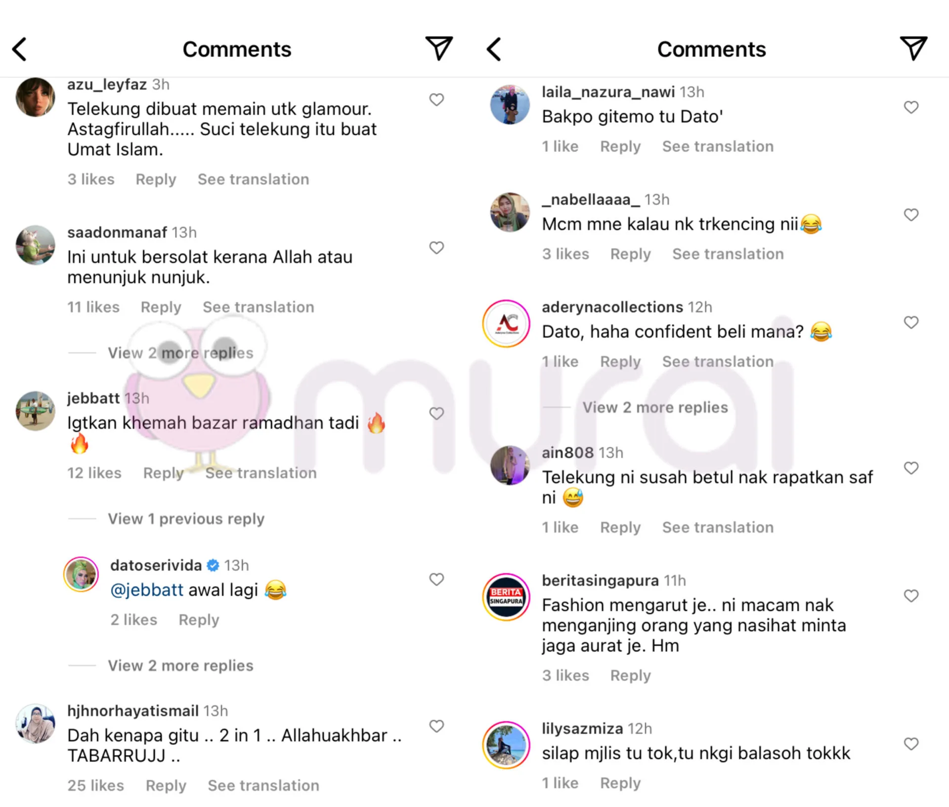 “Telekung dibuat memain untuk glamour. Astaghfirullah. Suci telekung itu buat umat Islam.”