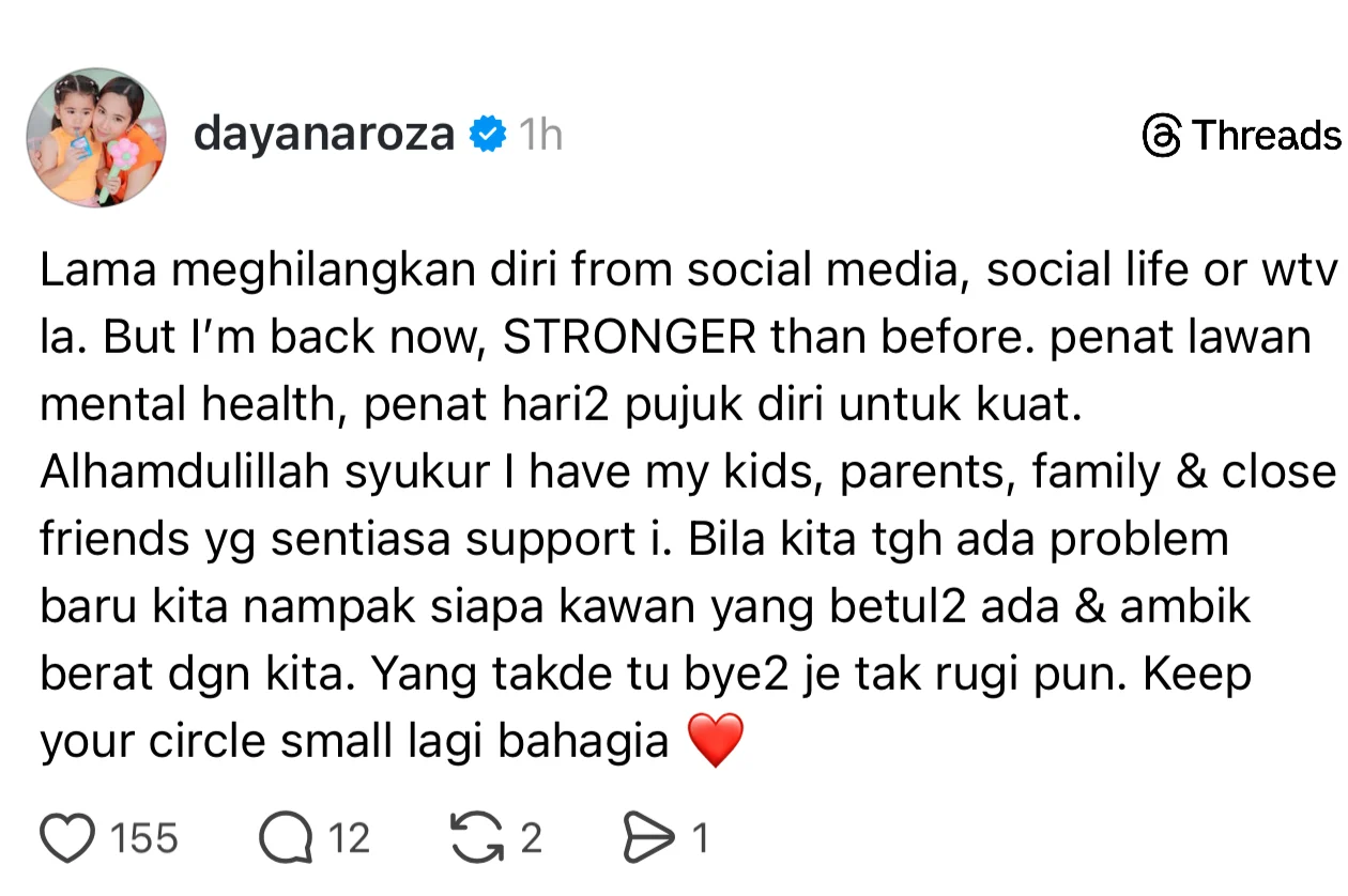 “Lama menghilangkan diri daripada media sosial, kehidupan sosial atau segalanya la. Tetapi kini saya kembali. Lebih kuat dari dulu. Penat lawan mental health, penat hari-hari pujuk diri untuk kuat.