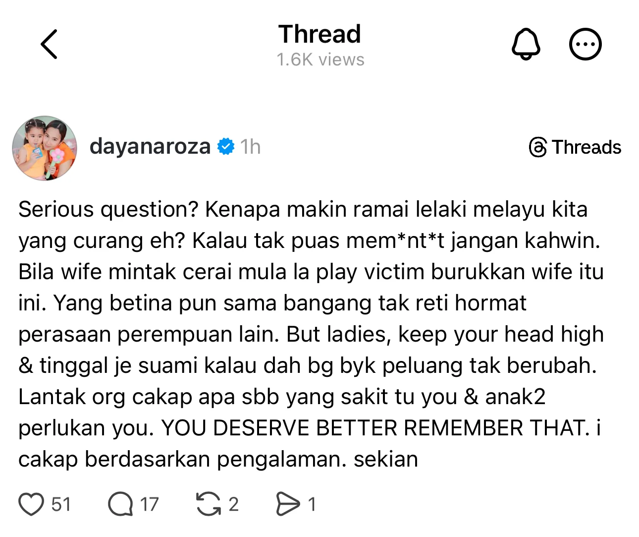 Dayana menerusi hantaran yang sudah di Thread, dilihat mempersoalkan sikap sesetengah lelaki Melayu semakin ramai yang curang dalam perkahwinan.