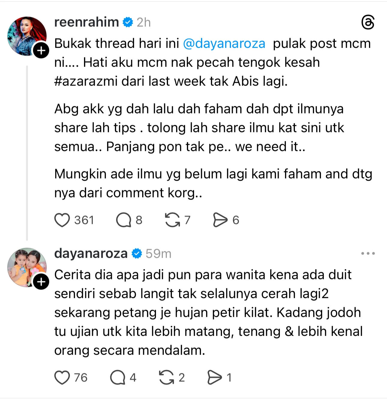 “Buka Thread hari ini Dayana Roza pulak post macam ni, Hati aku macam nak pecah tengok kisah Azar Azmi dari last week tak habis lagi.