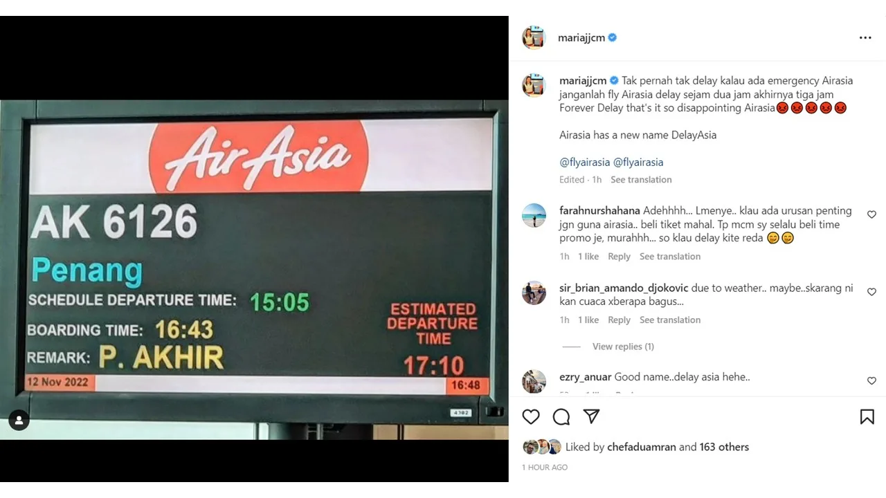 Dia yang turut meluahkan rasa kecewa turut memaklumkan bahawa sepatutnya syarikat ini ditukarkan nama daripada AirAsia kepada DelayAsia.