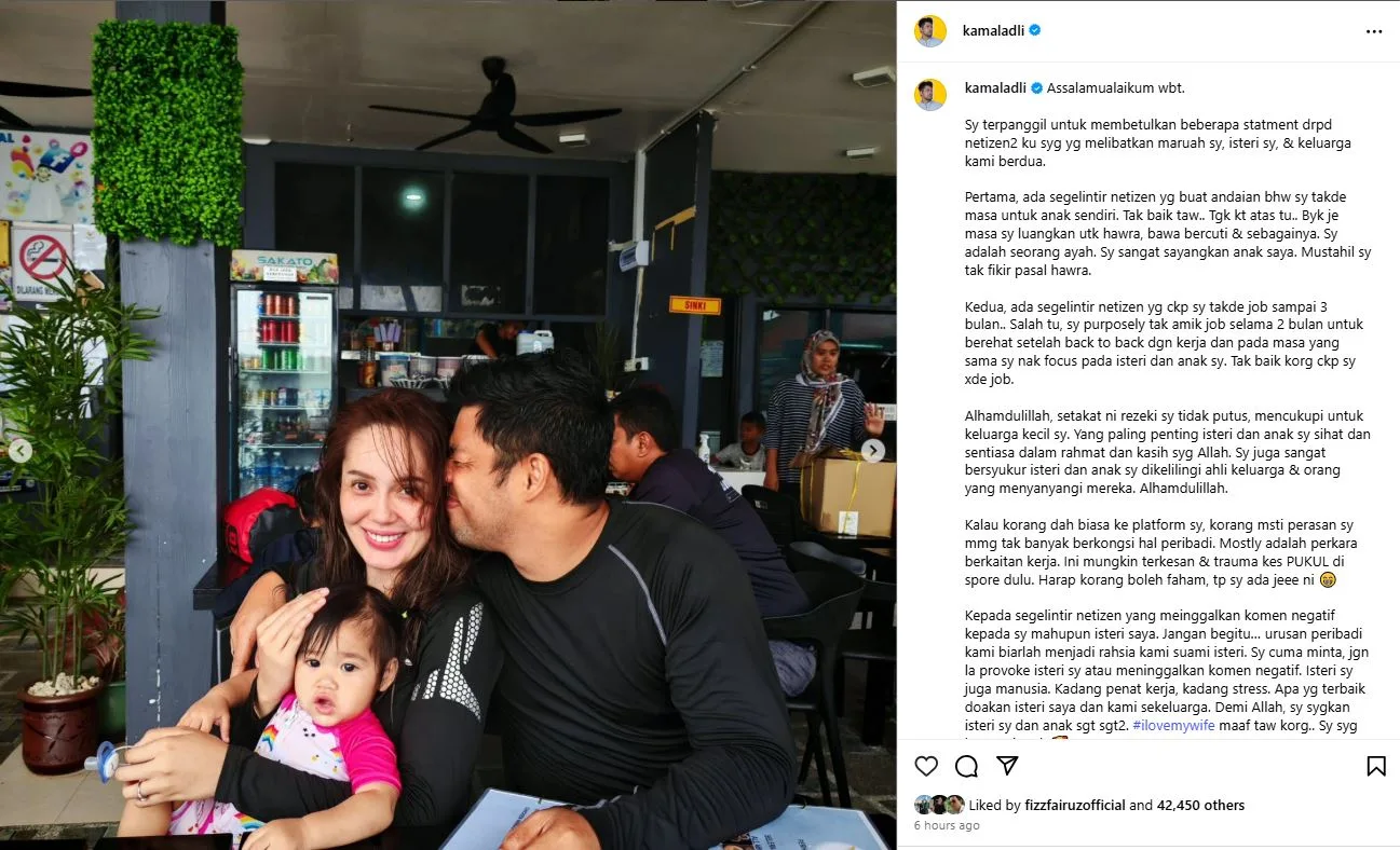 Menerusi satu hantaran di Instagram pada malam Sabtu, Kamal berkongsi beberapa gambar mesra mereka sekeluarga sambil menjelaskan bahawa dakwaan tersebut bukan sahaja tidak benar, malah menjatuhkan maruahnya sebagai seorang ayah.