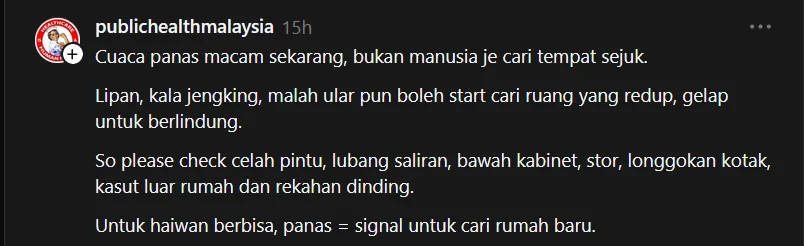 Situasi seperti ini bukanlah sesuatu yang mustahil, lebih-lebih lagi ketika cuaca panas melanda. Keadaan suhu tinggi mendorong haiwan berbisa seperti lipan, kala jengking dan juga ular untuk mencari tempat yang lebih sejuk, gelap dan lembap sebagai perlindungan.
