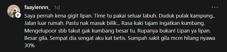 Ada yang pernah disengat lipan sehingga mengalami kesakitan yang digambarkan “tidak tertanggung”, manakala ada juga yang pernah berhadapan situasi cemas apabila haiwan berbisa tersebut tiba-tiba muncul di bahagian badan tanpa diduga.