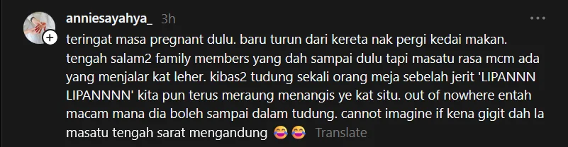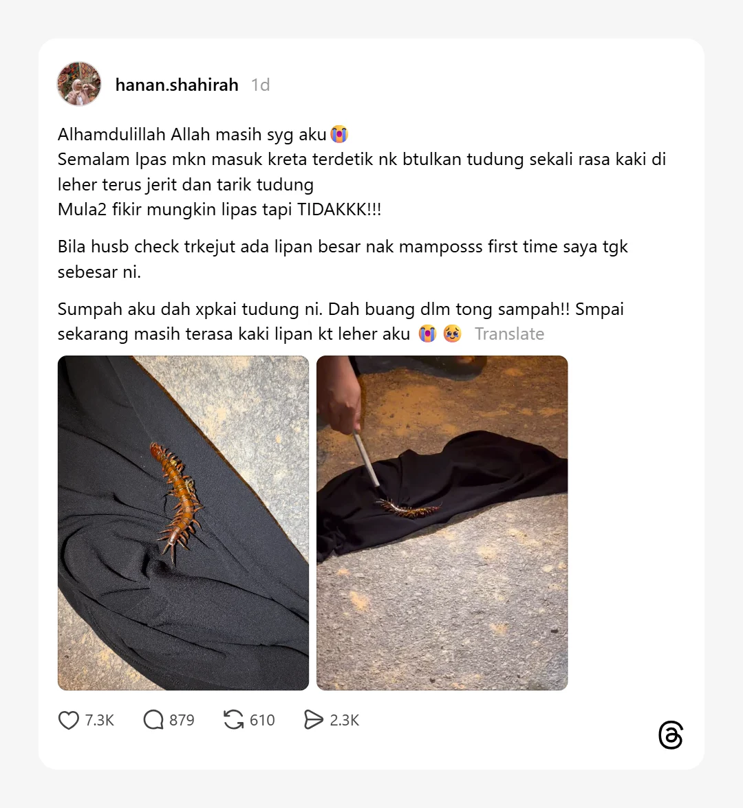 Baru-baru ini, satu perkongsian di Thread mencuri perhatian ramai apabila seorang wanita berkongsi pengalaman mencemaskan apabila menemui seekor lipan besar di dalam tudungnya.