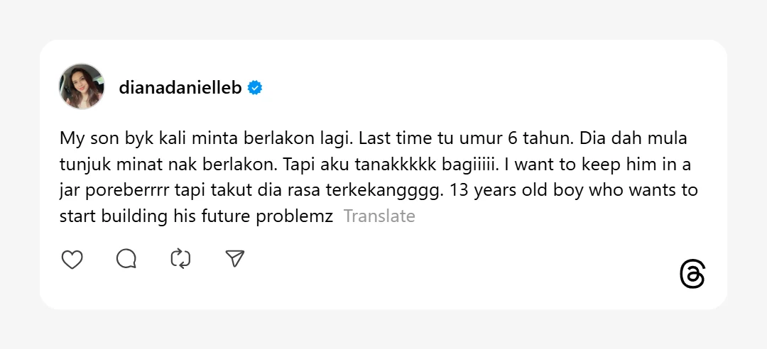 Tapi saya tak nak bagi. I want to keep him in a jar forever, tapi takut dia rasa terkekang. Masalah budak lelaki berumur 13 tahun yang mahu mula membina masa depan.”-kongsi Diana Danielle di Threads